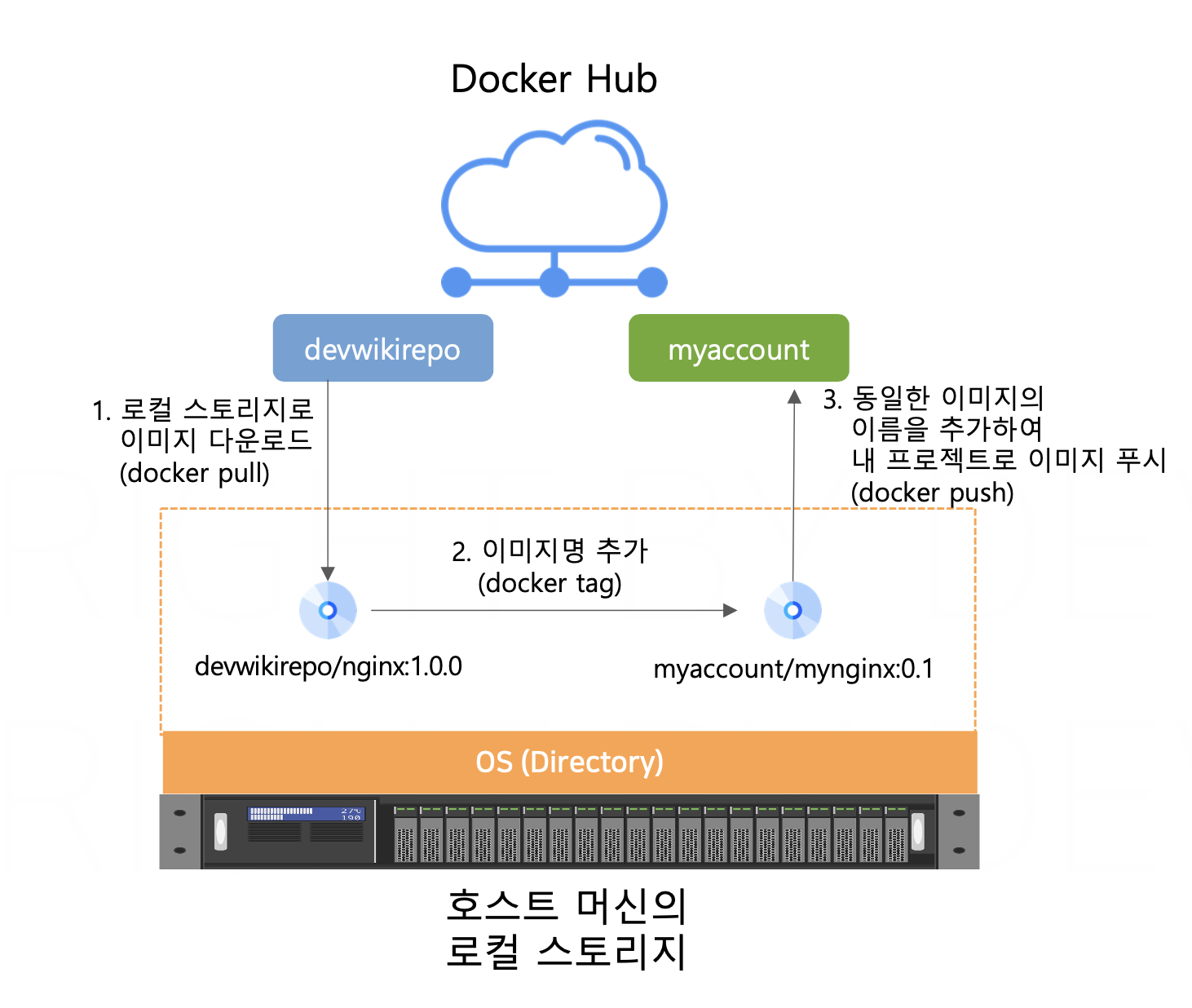 devwikirepo/simple-web:1.0 이라는 이미지 -> huncozyboy/my-simple-web:0.1로 태깅 -> Docker Hub에 푸시