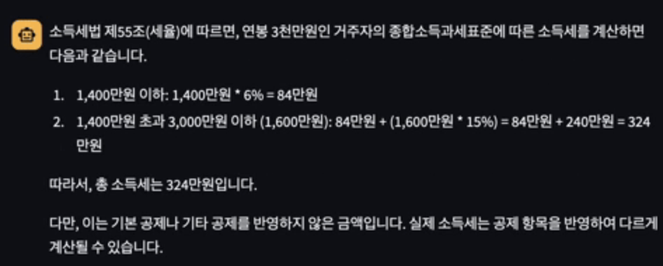 ex) 소득세법 제56조에 대한 질문이 들어오면, 해당 조항 내용을 기반으로 구체적인 수치와 해석을 포함한 답변을 제공함