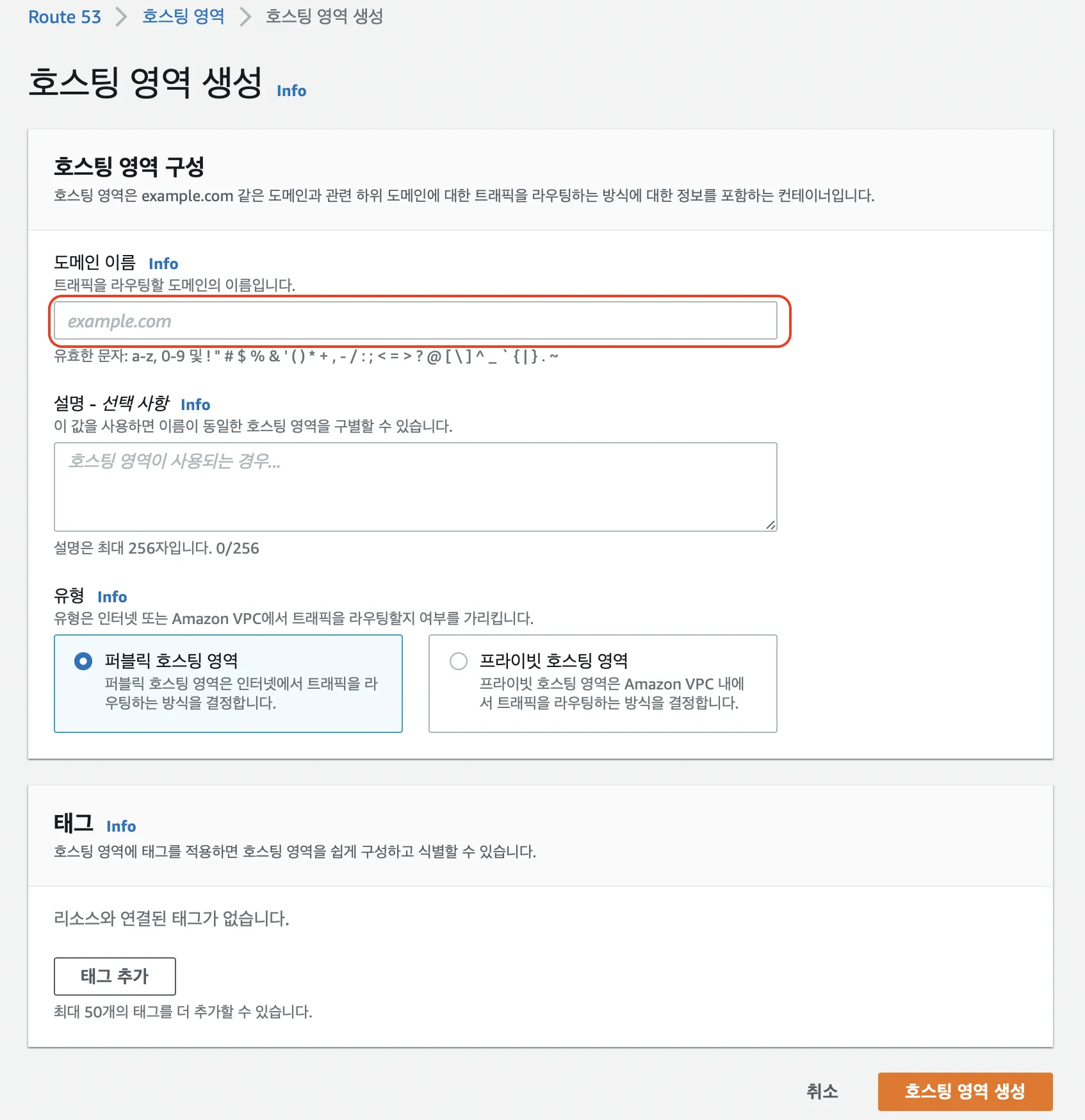 Route 53 콘솔 → “호스팅 영역 생성” → 도메인명 입력 (프로토콜(https://)이나 경로(/api) 같은 건 쓰지 않고, 순수하게 “example.com” 형태만 입력)