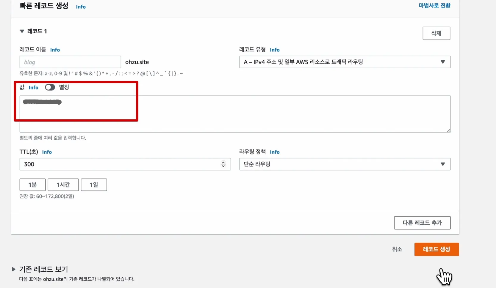 TTL(초): 기본 300 (권장: 300~600)